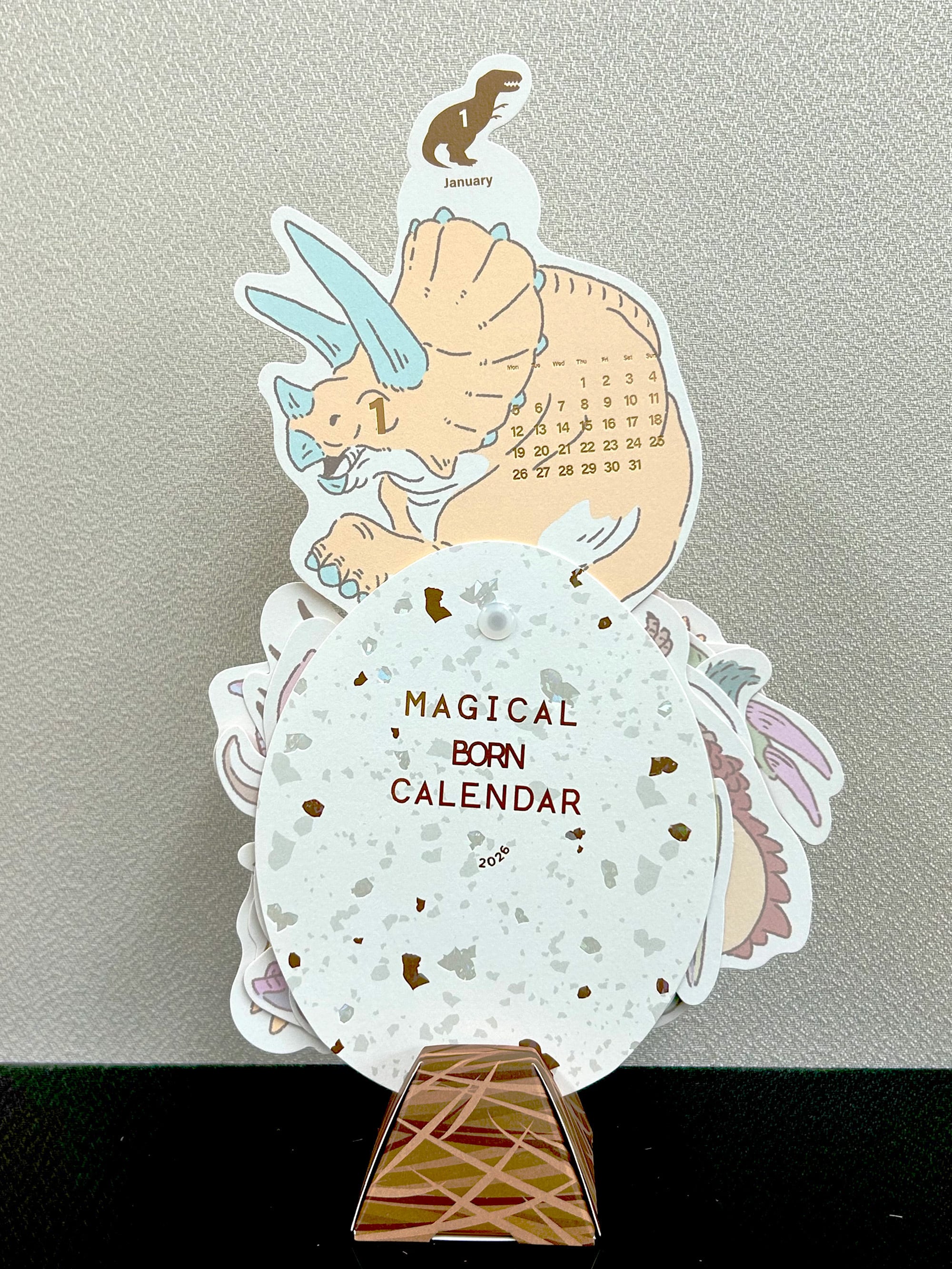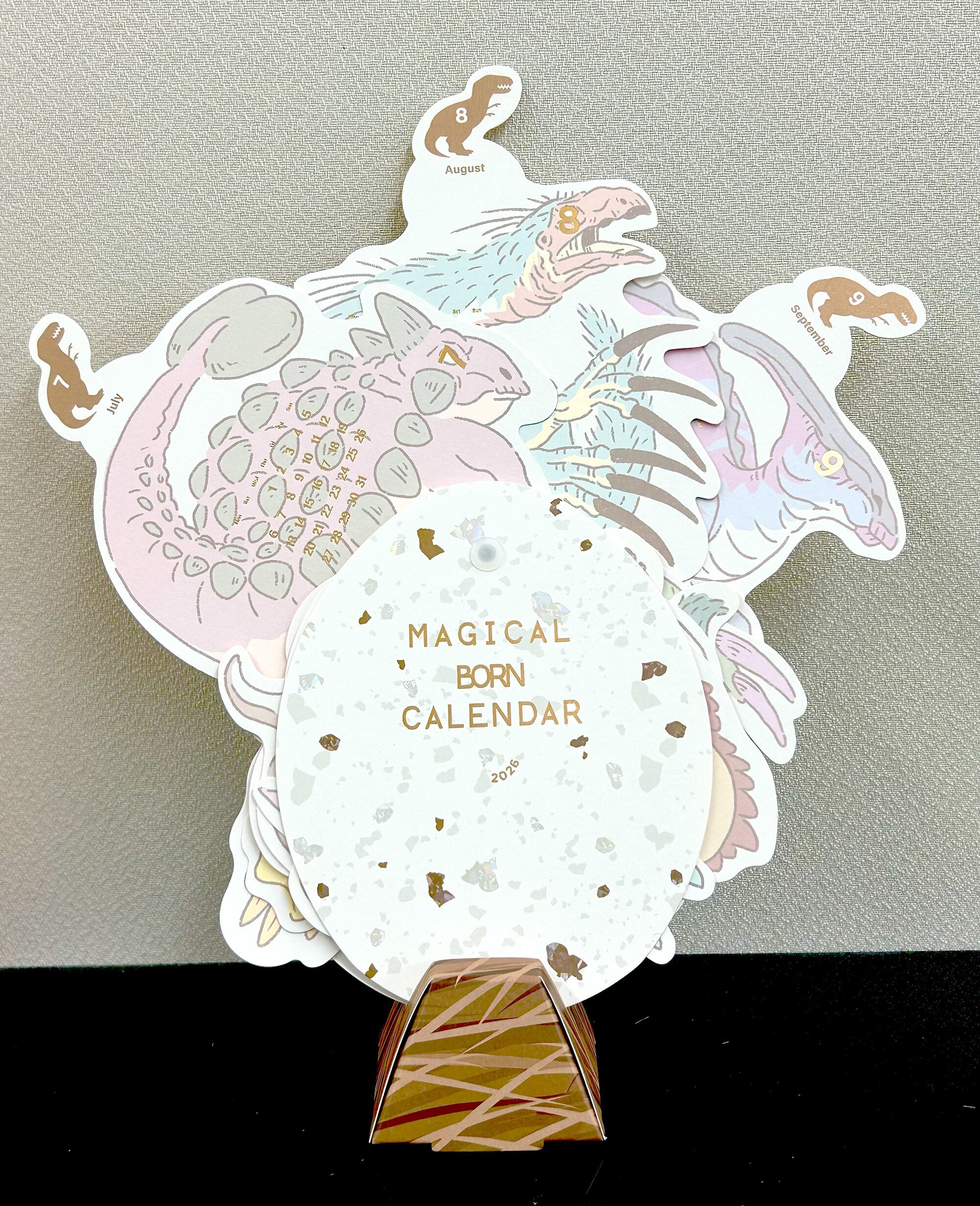 月ごとの様々な恐竜たちのイラストに箔押しのカレンダー日付がキラリと光ります。